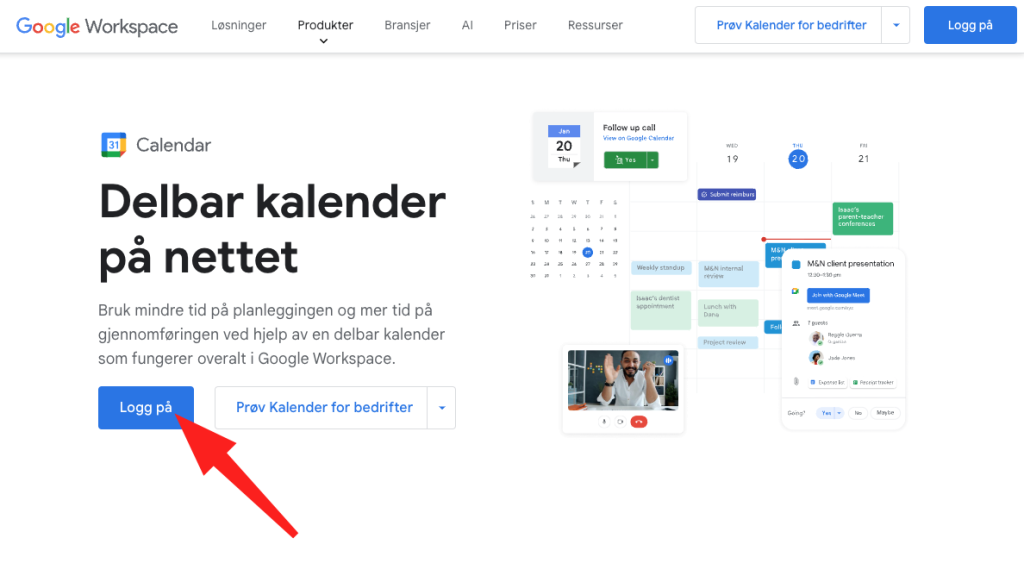 Steg 1: Gå til http://google.com/calendar og velg deretter «Logg på» som vist under: