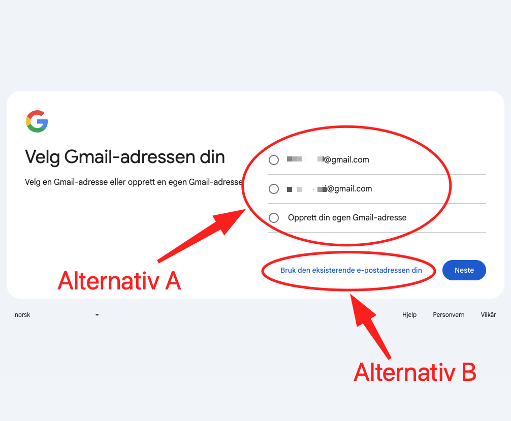 A) Velg mellom foreslåtte gmail-addresser eller skriv inn en egenvalgt ved å velge «Opprett din egen Gmail-adresse». Trykk deretter på «Neste»-knappen i nedre høyre hjørne.