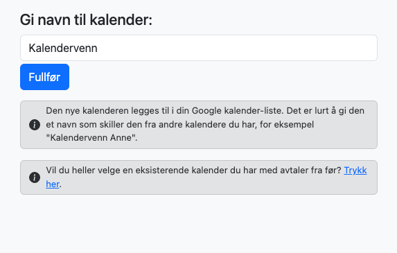 Her gir du et navn slik at du kan kjenne den igjen i kalender-listen, for eksempel Kalendervenn, og trykk deretter «Fullfør»: