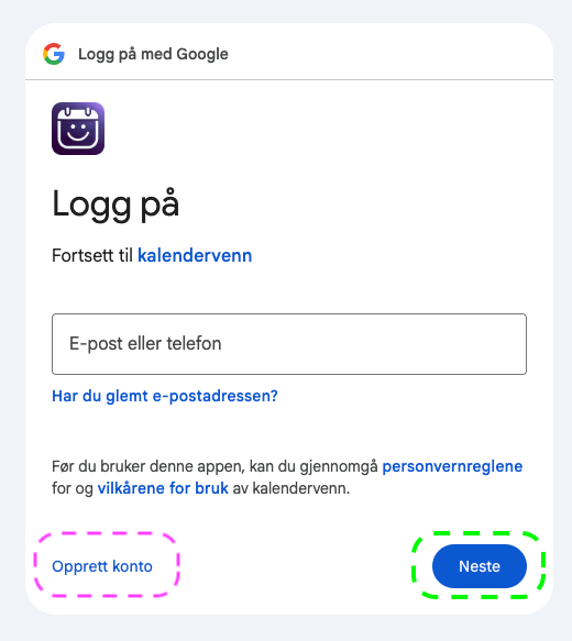 Logg enten på med din Google-konto og velg Neste (grønn). Eller trykk Opprett konto (rosa) for å opprette en ny – se detaljert guide for dette under: