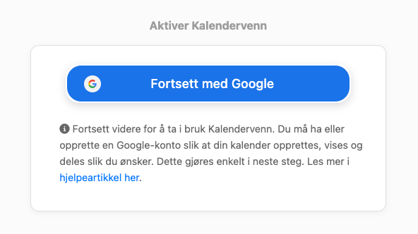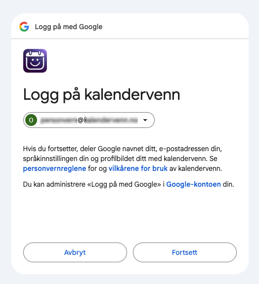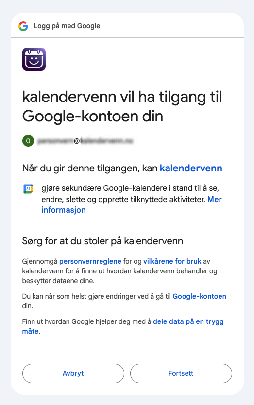 I dette steget gis tilgang for at den nye kalenderen kan opprettes i Google og brukes riktig i Kalendervenn. Velg fortsett som vist under: