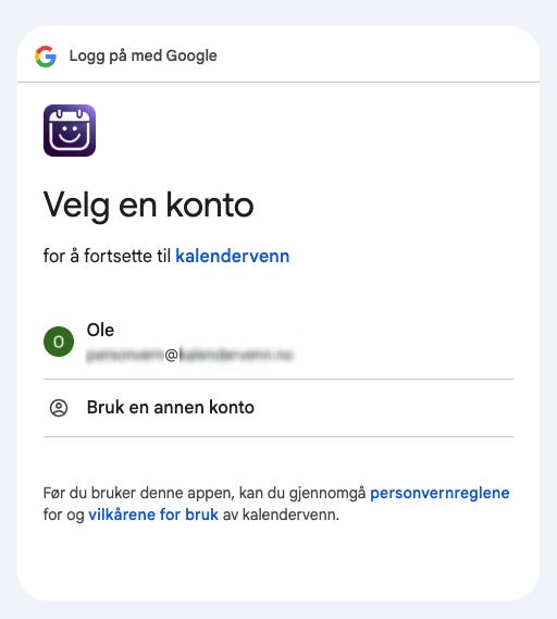 Vi inkluderer dette eksempelet for ordens skyld; Ole er selvstendig og håndterer administrering på egenhånd og husker innlogging. Han bruker sin egen Google-konto (eller oppretter en ny om han trenger), og knytter Kalendervenn til denne. Ole kan velge å dele kalenderen til flere i familien om han ønsker det, slik at de kan se eller legge inn avtaler.