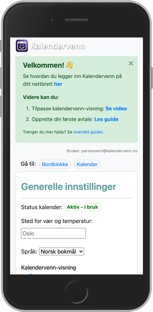 Deretter ser du innstillinger-siden som vist nedenfor. Tips: Første gangen ser du også en velkomst-melding på grønn bakgrunn med ekstra hjelp for å stille inn Kalendervenn til ditt behov